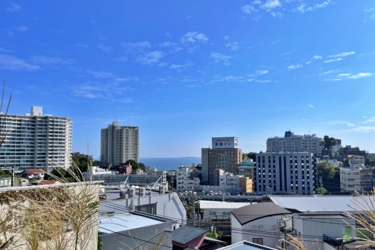 南側の道下から階段を上った先にある約65坪の平坦地。陽当たりの良い高台の土地で、ビルの合間に海を望みます。温泉付きなのもうれしいポイント。眺望もよく陽当たりも良好ですので、建物を建てたり家庭菜園やガーデニングなどにも使い勝手がよさそうです。