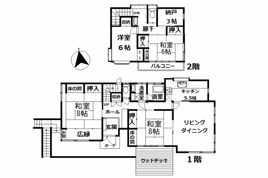 和風邸宅で落ち着きのある雰囲気があります。バルコニーからの眺めは開放感があり、ウッドデッキにはお気に入りの植栽を置いてリゾート風にするのもいいです。室内の一部はリフォーム済みです。