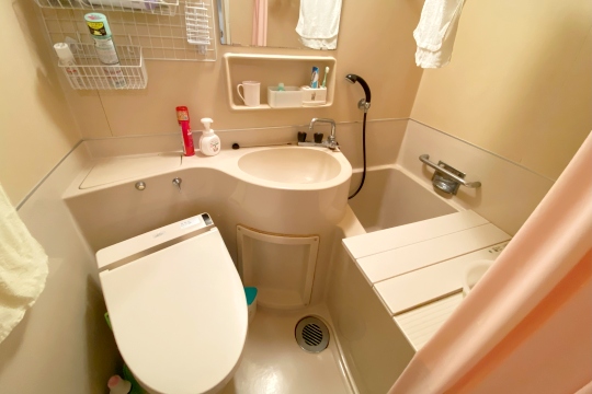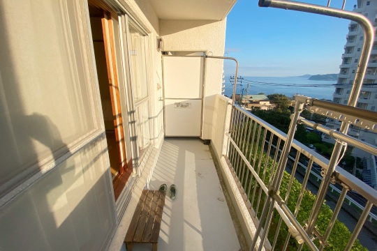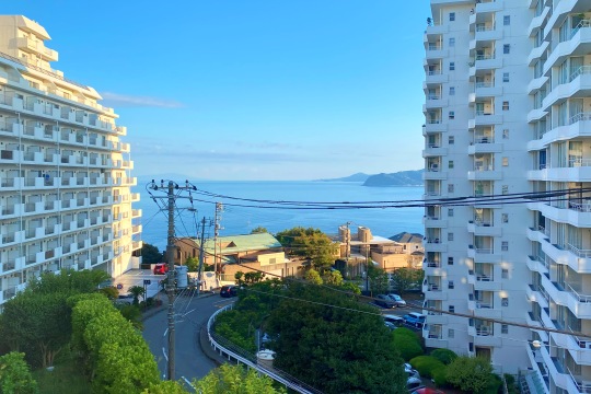 こちらは8階のお部屋です。バルコニーから海を綺麗に望むことが出来ます。間取りはコンパクトな1DK。日当たり良好で、シンプルな間取りなので自分好みの空間を作ることができます。熱海駅徒歩圏内で利便性良好。温泉大浴場や屋内・外のプールなど、充実の共用施設でリゾート気分を満喫しながらゆったりと過ごせるので、セカンドハウスやリモートワークの拠点としてのご利用もおすすめです。