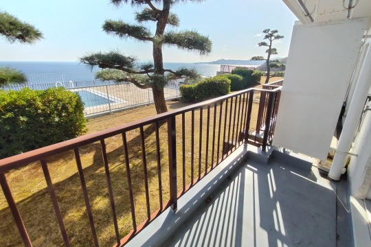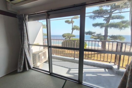 目の前に相模湾望む眺望良好の1LDK。バルコニー前にマンションのお庭があり、松の木と碧く煌めく海を同時に眺める風情ある景色が広がります。海を眺めながら寛げる和室と約16帖のLDKのある間取りで、気軽なリゾート利用にぴったり。温泉大浴場など共用施設が充実しているので思い思いのリゾートライフを癒しの海景色と共に過ごしてみてはいかがでしょうか。